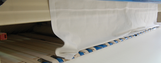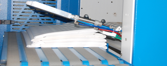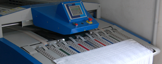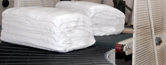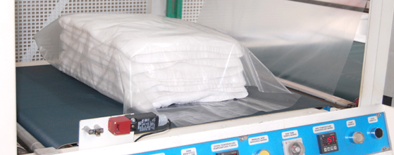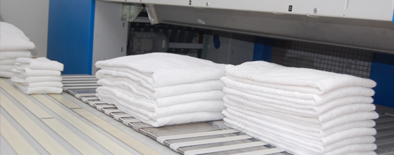 La biancheria stirata viene piegata ed impilata dai piegatori ed è quindi pronta per il processo di imballaggio a mezzo di plastica termosaldata al fine di raggiungere il mantenimento dello standard qualitativo ed di igiene.